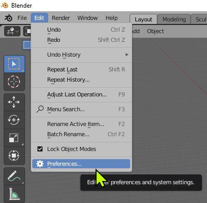 To try a different Theme, in fact, to customise Blender to your personal choice you go to the Preferences Editor by clicking Edit, Preferences in the Screen Header..