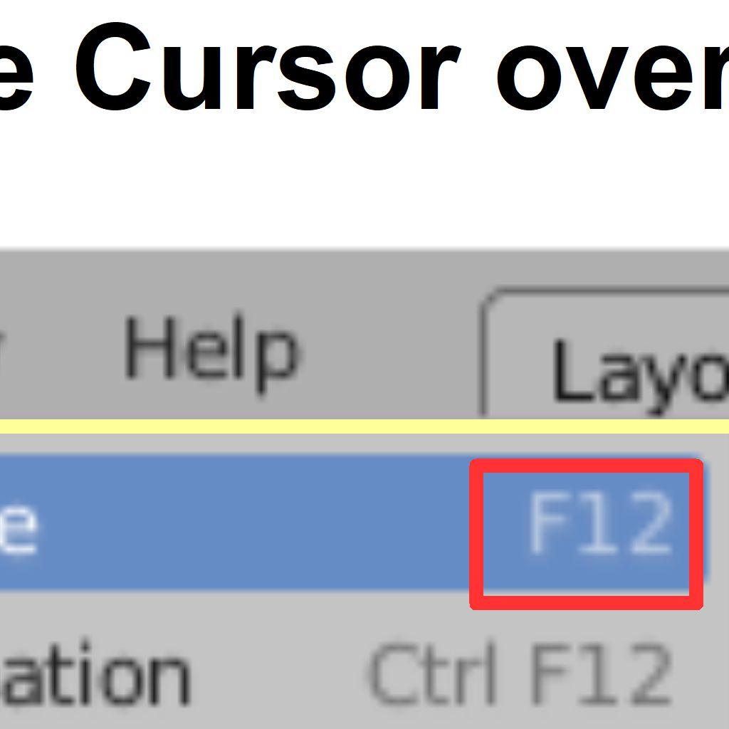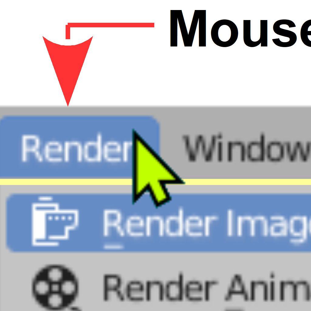 The example above means; in the Blender Screen Header, position the Mouse Cursor over the Render Properties button and click the left mouse button, clicking once. In this case the signal received by the computer with the Mouse Cursor at the position of the Render Properties button tells the computer to display the Render Options Sub Menu. Positioning the Mouse Cursor over Render Image in the sub menu and clicking once renders an image of Camera View (what the camera sees). The Rendered Image is displayed in a new Editor panel, the Image Editor. The image may be saved from this location but for the time being press Esc on the Keyboard to cancel the render and return to the 3D Viewport Editor.