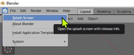 Note: Clicking the Left Mouse Button with the Mouse Cursor in the 3D Viewport Editor cancels the display of the Splash Screen (Reinstate as previously described).