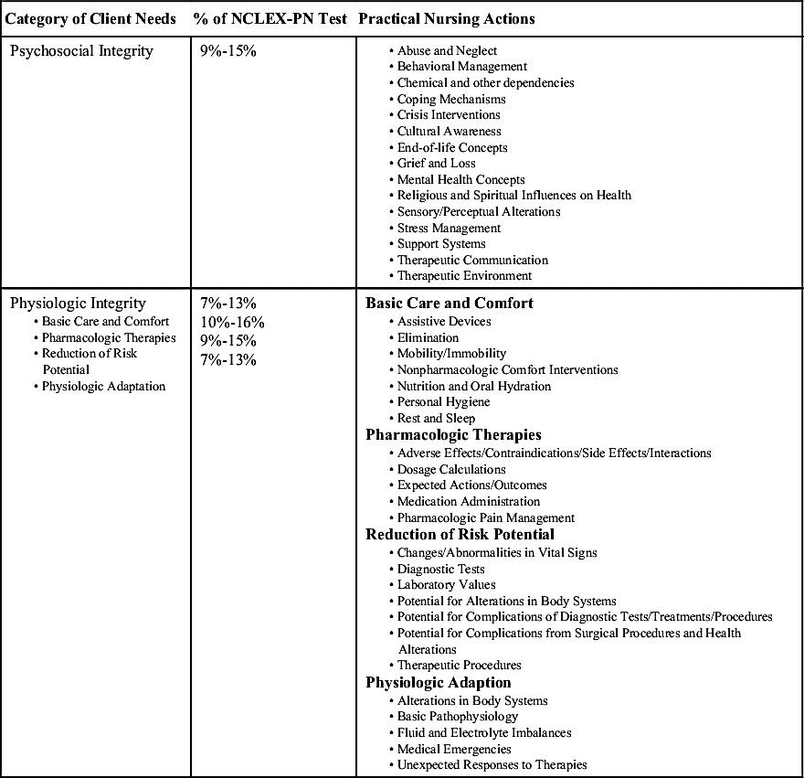Adapted from National Council of State Boards of Nursing, Inc NCLEX-PN Examination: Test Plan for the National Council Licensure Examination for Licensure Practical/Vocational Nurses, 2015, Chicago, IL www ncsbn org