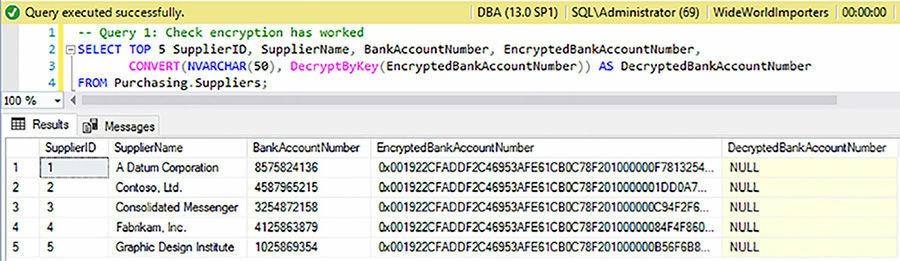 -- Query 1: Check encryption has worked SELECT TOP 5 SupplierID, SupplierName, BankAccountNumber, EncryptedBankAccountNumber, CONVERT(NVARCHAR(50),