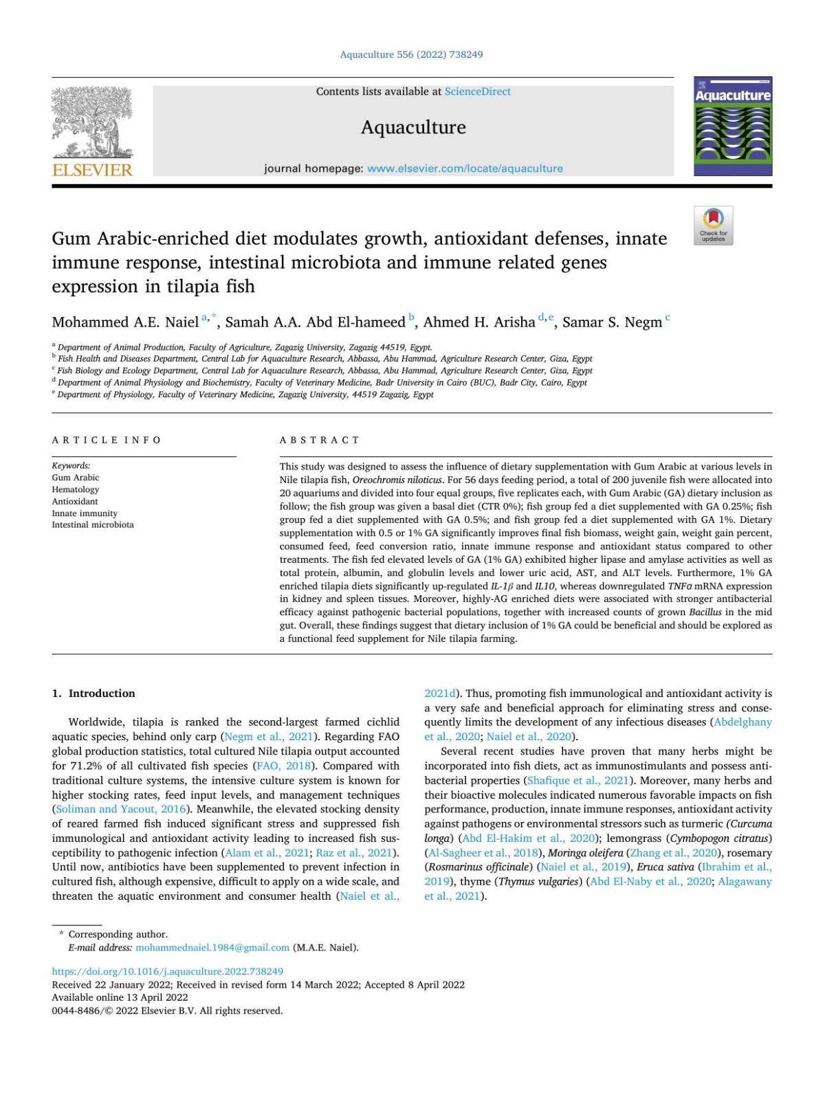 Gum Arabic-enriched diet modulates growth, antioxidant defenses, innate immune response, intestinal microbiota and immune related genes expression in tilapia fish