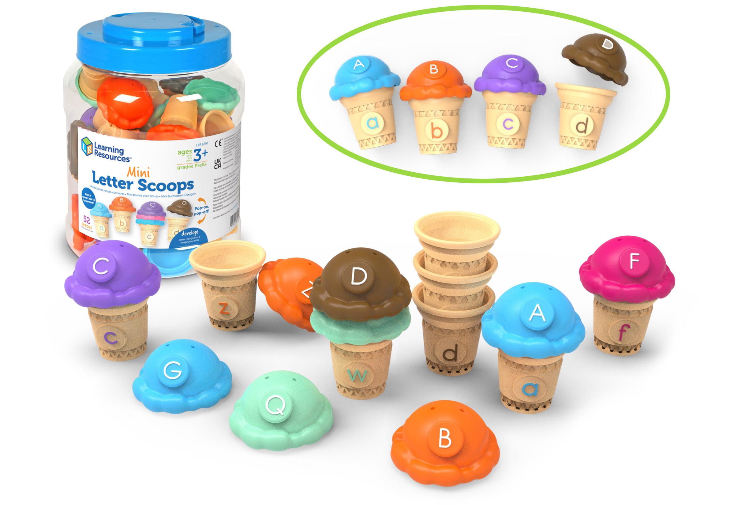 Serve up a scoop of preschool letter skills! This set of 26 matching cones and ice cream scoops is ready for letter-matching fun—identify the uppercase letter on the ice cream, then match it to the lowercase letter on the cone. Plus: pop-on, pop-off scoops stack for imaginative play-food fun!