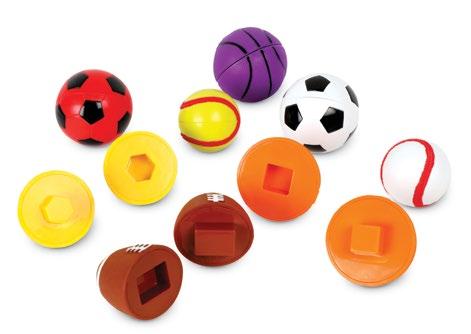 Kids develop game-winning preschool shape skills as they snap, match, and learn with this set of 8 two-piece balls. Includes five shapes (rectangle football, hexagon volleyball, square basketball, heart baseball, and triangle soccer ball) in eight colors, plus reusable storage bucket. Basketball measures 2½".