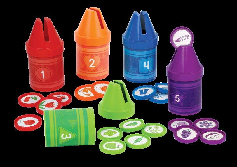 Build vibrant counting, color, and matching skills with this set of five numbered crayons and 25 illustrated, double-sided color coins. Drop the coins into the crayons’ slots to build fine motor skills! Pieces store inside crayons for easy cleanup. Crayons measure 3"L x 3"W x 5¾"H.
