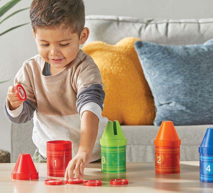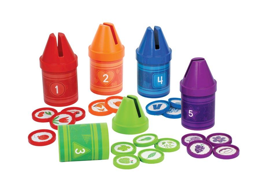 Build vibrant counting, color, and matching skills with this set of five numbered crayons and 25 illustrated, double-sided color coins. Drop the coins into the crayons’ slots to build fine motor skills! Pieces store inside crayons for easy cleanup. Crayons measure 3"L x 3"W x 5¾"H.