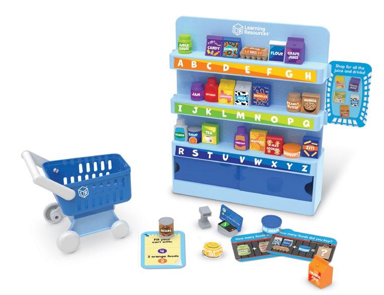 Kids learn about vowels, consonants, and beginning sounds as they strengthen fine motor skills with each imaginative pretend shopping trip. Includes 29 mini products, plus store shelf, rolling mini shopping cart, and 20 double-sided Activity Cards. Shelf measures 8¼"L x 2¼"W x 9½"H.