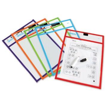 Includes five clear pockets and five dry-erase markers with eraser tips, which store in the loop on each pocket. Set of 10 pockets measures 10"L x 14"H each.