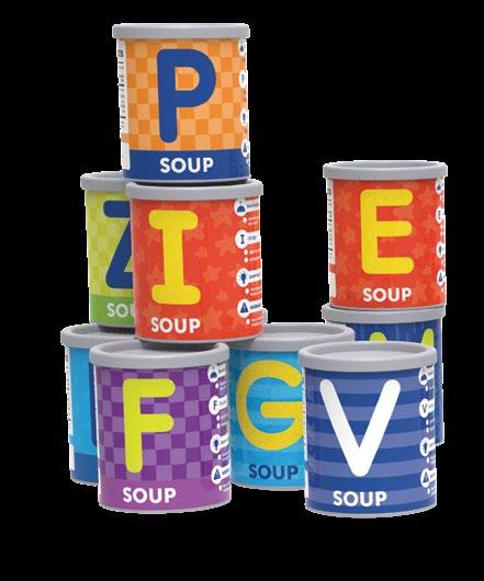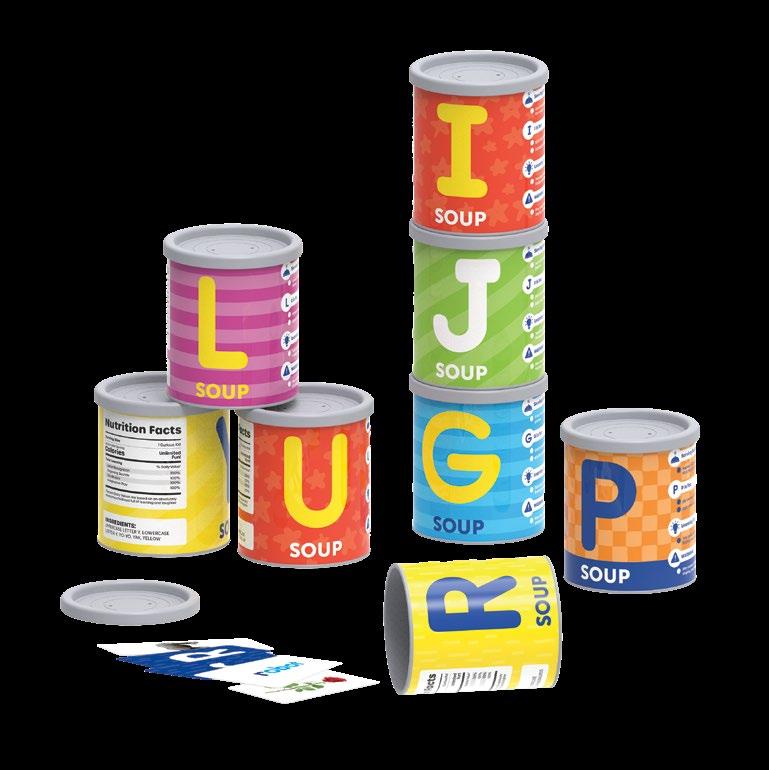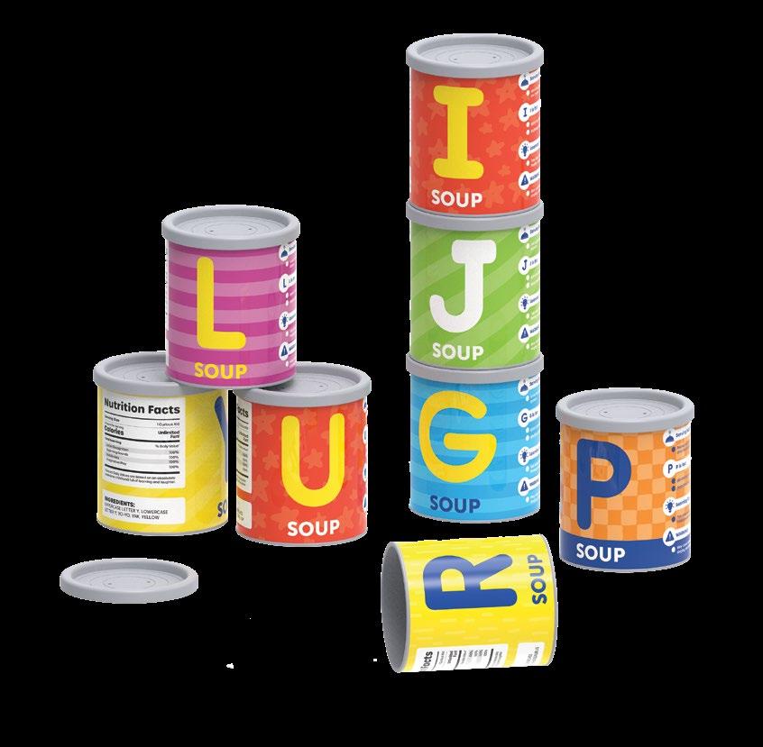 A fresh new look for an all-time favorite! Kids build letter recognition, phonics, and reading skills as they sort the language cards into letter soup cans. Includes five cards per letter: uppercase, lowercase, and three picture cards! Plus, read the labels for silly learning fun! Soup cans measure 3¼"L x 2¾"W x 2¾"H.