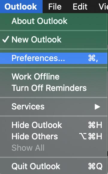 To change your email signature, go to the Microsoft Outlook application. In the top left corner, click on Outlook, then Preferences.