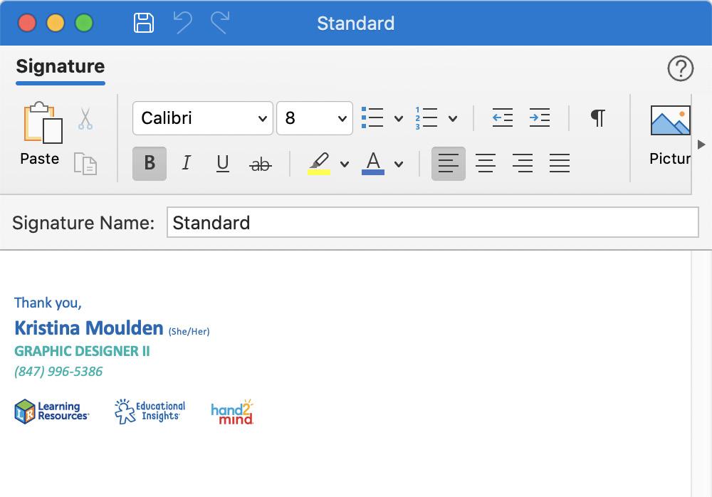 Paste the copied signature template and edit each of the fields (Name, pronouns, title, Ring Central phone number).