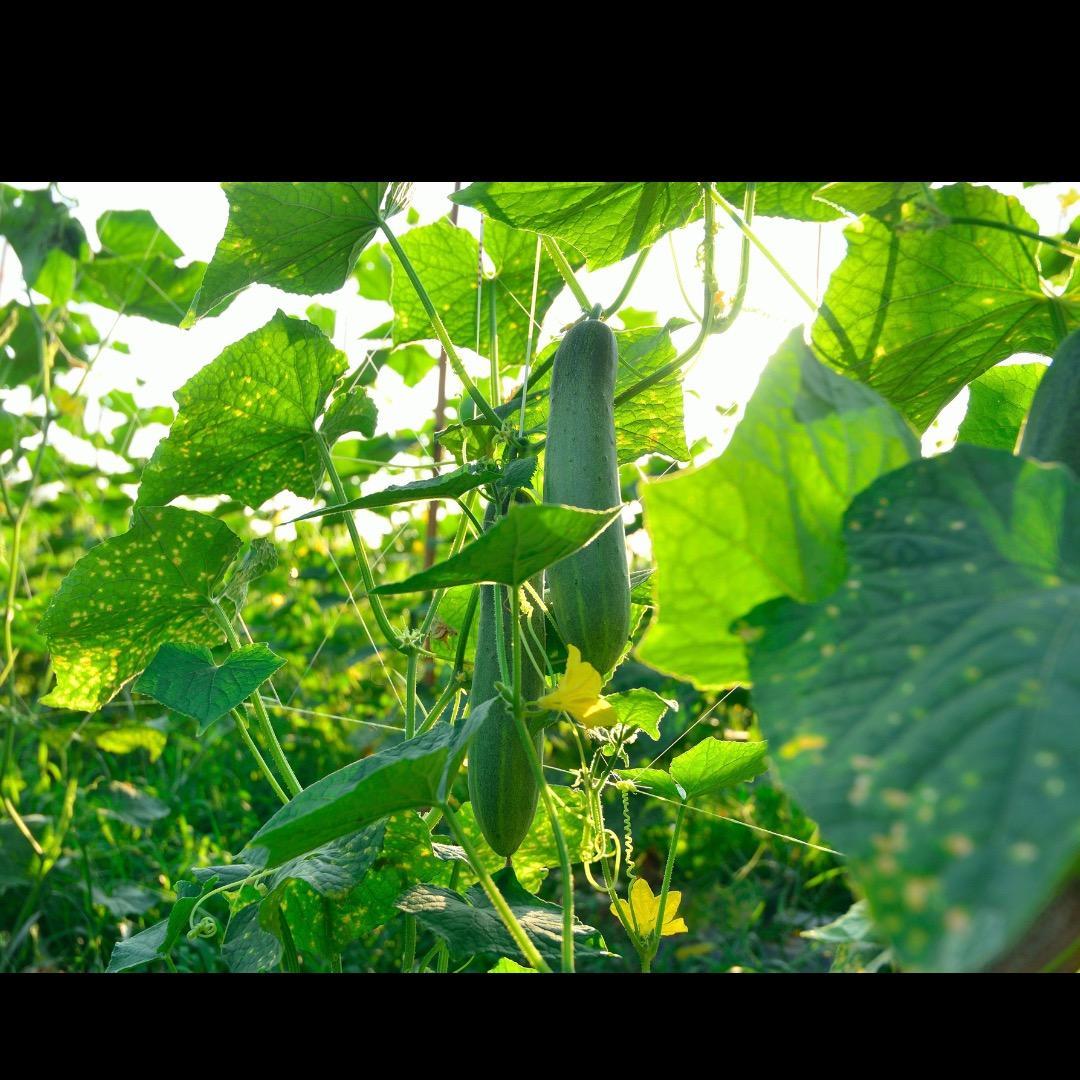 The large leaves on the cucumber plant provides shade for the developing fruit. Bees are essential pollination of cucumbers.
