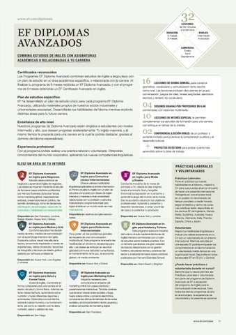 EF Diploma Avanzado en inglés para Comunicaciones Internacionales Obtené valiosas habilidades lingüísticas aplicables al ámbito internacional. Poné a prueba tu inglés con un plan de estudios compuesto por clases de inglés intensivo y materias a nivel universitario relacionadas con tu profesión o estudios. Este exclusivo programa es ideal para lograr el éxito en un mundo cada vez más internacional.