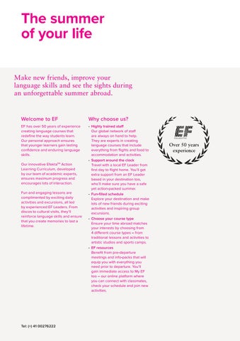 -- Highly trained staff Our global network of staff are always on hand to help. They are experts in creating language courses that include everything from flights and food to accommodation and activities. -- Support around the clock Travel with a local EF Leader from first day to flight home. You’ll get extra support from an EF Leader based in your destination too, who’ll make sure you have a safe yet action-packed summer. -- Fun-filled schedule Explore your destination and make lots of new friends during exciting activities and inspiring group excursions. -- Choose your course type Ensure your time abroad matches your interests by choosing from 4 different course types – from traditional lessons and activities to artistic studios and sports camps. -- EF resources Benefit from pre-departure meetings and info-packs that will equip you with everything you need prior to departure. You’ll gain immediate access to My EF too – our online platform where you can connect with classmates, check your schedule and join new activities.