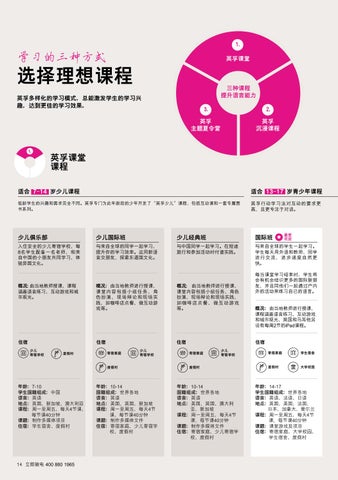 年龄:14-17 学生国籍组成:世界各地 语言:英语、法语、日语 地点:英国、美国、法国、 日本、加拿大、爱尔兰 课程:周一至周五,每天4节 课,每节课40分钟 课题:课堂游戏及项目 住宿:寄宿家庭、大学校园、 学生宿舍、度假村