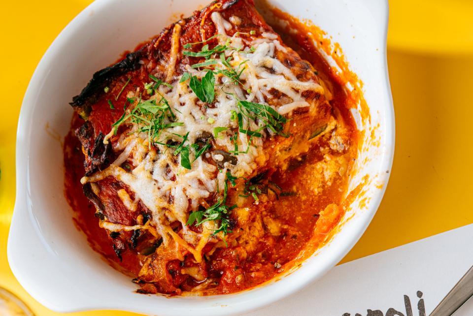Tender beef rib ragu & choked, layered between lasagna sheets in a creamy bechamel sauce, topped with crust, Parmigiano Reggiano