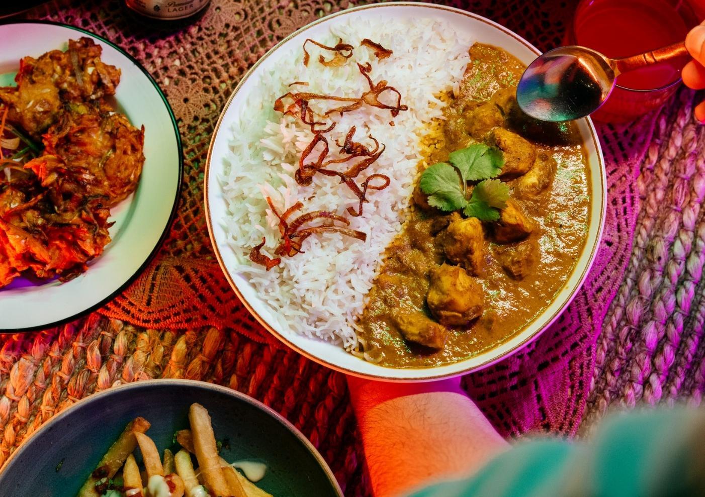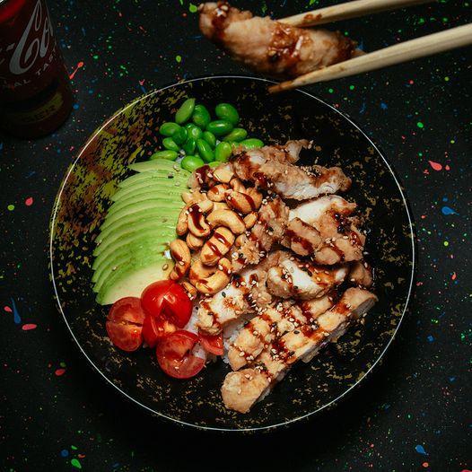 • Chicken Tikka Protein bowl with grilled chicken tikka, pilau rice, vegetables, coriander mint, yoghurt & green chutney.