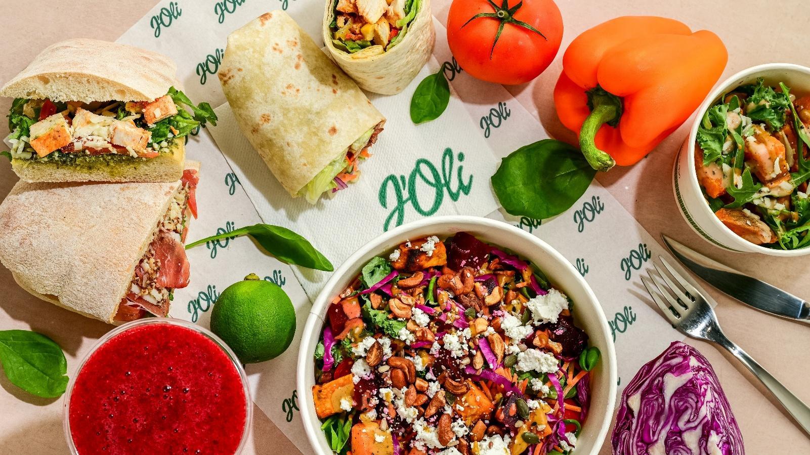 Falafel, feta, mixed leaves, hummus, croutons, cherry tomato, red onion, lemon, cucumber, sweet tahini & sesame dressing. 28g P / 66g C / 50g F.