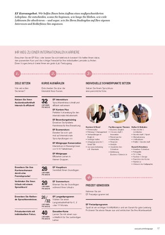 EF Intensivkurs Sprachkenntnisse schnell und effizient verbessern. EF Karriere Plus Perfekte Vorbereitung für den internationalen Arbeitsmarkt. EF Bewerbungstraining Erwerben Sie fundierte Kenntnisse für Ihre Bewerbung. EF Examenskurs Bereitet Sie sich opti mal auf internationale Sprachprüfungen vor. EF Minigruppe Konversation Intensivkurs in Klassengrössen von 8-10 Teilnehmern.