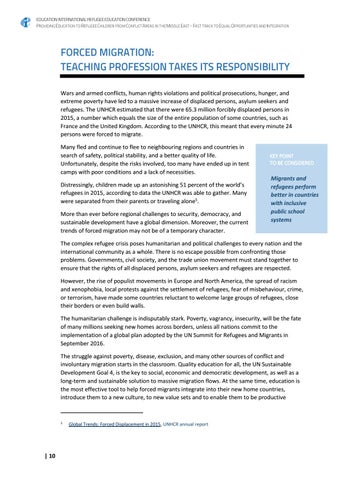 The complex refugee crisis poses humanitarian and political challenges to every nation and the international community as a whole. There is no escape possible from confronting those problems. Governments, civil society, and the trade union movement must stand together to ensure that the rights of all displaced persons, asylum seekers and refugees are respected. However, the rise of populist movements in Europe and North America, the spread of racism and xenophobia, local protests against the settlement of refugees, fear of misbehaviour, crime, or terrorism, have made some countries reluctant to welcome large groups of refugees, close their borders or even build walls. The humanitarian challenge is indisputably stark. Poverty, vagrancy, insecurity, will be the fate of many millions seeking new homes across borders, unless all nations commit to the implementation of a global plan adopted by the UN Summit for Refugees and Migrants in September 2016. The struggle against poverty, disease, exclusion, and many other sources of conflict and involuntary migration starts in the classroom. Quality education for all, the UN Sustainable Development Goal 4, is the key to social, economic and democratic development, as well as a long-term and sustainable solution to massive migration flows. At the same time, education is the most effective tool to help forced migrants integrate into their new home countries, introduce them to a new culture, to new value sets and to enable them to be productive