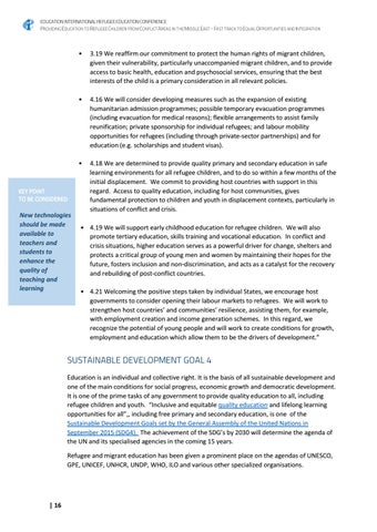 • 4.19 We will support early childhood education for refugee children. We will also promote tertiary education, skills training and vocational education. In conflict and crisis situations, higher education serves as a powerful driver for change, shelters and protects a critical group of young men and women by maintaining their hopes for the future, fosters inclusion and non-discrimination, and acts as a catalyst for the recovery and rebuilding of post-conflict countries. • 4.21 Welcoming the positive steps taken by individual States, we encourage host governments to consider opening their labour markets to refugees. We will work to strengthen host countries’ and communities’ resilience, assisting them, for example, with employment creation and income generation schemes. In this regard, we recognize the potential of young people and will work to create conditions for growth, employment and education which allow them to be the drivers of development.”