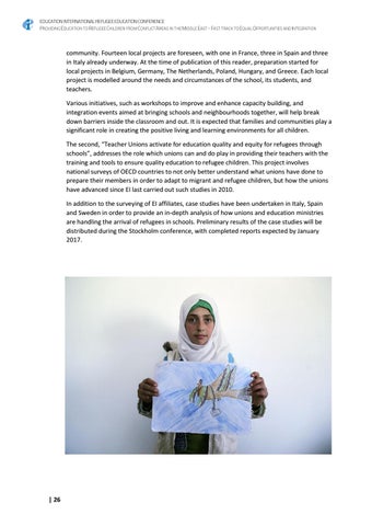 community. Fourteen local projects are foreseen, with one in France, three in Spain and three in Italy already underway. At the time of publication of this reader, preparation started for local projects in Belgium, Germany, The Netherlands, Poland, Hungary, and Greece. Each local project is modelled around the needs and circumstances of the school, its students, and teachers. Various initiatives, such as workshops to improve and enhance capacity building, and integration events aimed at bringing schools and neighbourhoods together, will help break down barriers inside the classroom and out. It is expected that families and communities play a significant role in creating the positive living and learning environments for all children. The second, “Teacher Unions activate for education quality and equity for refugees through schools�, addresses the role which unions can and do play in providing their teachers with the training and tools to ensure quality education to refugee children. This project involves national surveys of OECD countries to not only better understand what unions have done to prepare their members in order to adapt to migrant and refugee children, but how the unions have advanced since EI last carried out such studies in 2010. In addition to the surveying of EI affiliates, case studies have been undertaken in Italy, Spain and Sweden in order to provide an in-depth analysis of how unions and education ministries are handling the arrival of refugees in schools. Preliminary results of the case studies will be distributed during the Stockholm conference, with completed reports expected by January 2017.