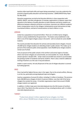 teachers often teach both shifts and report being overworked. It can also undermine the provision of good quality education and learning outcomes.” (GMR/UNHCR Policy Paper 26, May 2016) Education programmes are led by the Education Ministry in close cooperation with UNHCR, UNICEF, and other aid agencies. EI member organisations in Lebanon report that obstacles to the delivery of quality education to both Lebanese and Syrian students are: differences between Lebanese and Syrian curriculums, classroom size, different academic levels, transportation costs for the refugees, limited psycho-social interventions to help traumatized children, and lack of trained teachers to teach children in crisis.