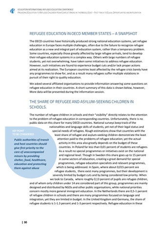 The number of refugee children in schools and their “visibility� directly relates to the attention to the problem of refugee education in corresponding countries. Unfortunately, there is no public data on this share for many OECD countries. National surveys keep track of the nationalities and language skills of students, yet not of their legal status and KEY POINT special needs of refugees. Rough estimations show that countries with the TO BE CONSIDERED least share of refugee and asylum-seeking children demonstrate the least attention paid to the problems of refugee education; yet the actual Public authorities of transit activity in this area also greatly depends on the budget of these and host countries should countries. In Poland far less than 0,01 percent of students are refugees. give first priority to the As a result no special programmes or initiatives exist on the national care of unaccompanied and regional level. Though in Sweden this share goes up to 15 percent minors by providing in some sectors of education, creating a great demand for special shelter, food, healthcare, programmes, refugee education specialists and relevant programmes, education and protecting which is being addressed. In Spain, where about 0,015 percent are them against abuse refugee students, there exist many programmes, but their development is severely limited by budget cuts and by being considered low priority. When we look to Canada, where roughly 0,13 percent of pupils are refugee children, and of whom only children under 14 are considered part of this group, programmes are mainly designed and distributed by NGOs and other public organisations, while national priorities concern mostly more general immigrant education. In the Netherlands there are 0,5-1 percent of refugee children in schools and there are many programmes focused on language and integration, yet they are limited in budget. In the United Kingdom and Germany, the share of refugee students is 1-1.3 percent and 1-3 percent respectively. Refugee education in these