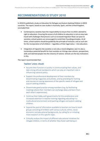 Teachers’ unions should: • Assume their function in society in communicating their values, and take strong ethical standpoints which can play an important role in influencing national policy; • Support the professional development of their members by disseminating magazines and articles, and by providing for training and courses on raising awareness of the specific needs of refugee and asylum seeking children; • Disseminate good practice among members (e.g. by facilitating meetings where their members can exchange ideas and learn from each other’s experiences); • Continue their lobby with governments for the amelioration and increased attention in teacher training regarding educating in a multicultural environment and teaching refugee and asylum seeking children; • Expand the pool of information available to teachers on how to teach groups consisting of children with various cultural, ethnic, socioeconomic and educational backgrounds, by calling for or initiating more research on this specific topic. • Critically analyse the impact of different educational initiatives for refugee children, in terms of whether they foster well-being or