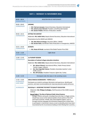 1st PLENARY SESSION Description of national refugee education situations Moderator: Ms. Haldis Holst, Deputy General Secretary, Education International