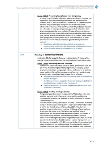 Workshop B – SUPPORTING TEACHERS Moderator: Mr. Fernando M. Reimers, Ford Foundation Professor of the Practice in International Education, Harvard Graduate School of Education Round Table 5: Addressing Teachers’ Shortages To keep their national teaching forces on steam, governments have the possibility of establishing retention programmes, developing special programmes to attract young people into the profession or to facilitate career switches. None of these programmes, however, would remedy acute shortages caused by a large increase flux of refugees. What measures can transit and host countries take to address acute teacher shortages? Could these measures include the temporary employment of not yet qualified teachers and/or teachers’ assistants? Could these measures include the engagement of volunteers? If so, under which conditions? Round Table 6: Teaching in Refugee Centres Refugee camps and centres in Europe and the Middles East often lack qualified teachers, basic infrastructure, and teaching and learning resources which hamper the provision of quality education for refugee children and youth. The GMR/UNHCR policy paper 26 (see also page …) notes that in refugee camps in developing countries qualified teachers are often not available at all. “In the Dadaab camps in Kenya, about 10% of teachers are qualified Kenyan teachers, the remaining 90% being refugee teachers drawn from the camps, only 2% of whom are qualified. Several international NGOs provided new teacher recruits with 5 to 14 days of induction training. However, these workshops lacked a common framework identifying the basic knowledge and skills teachers should be expected to demonstrate. To address this, a teacher management and development strategy for 2013–15 recommended a shift towards schoolbased development and problem-solving. The strategy also proposed qualification and certification options for teachers who meet minimum