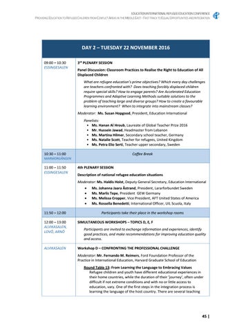 3rd PLENARY SESSION Panel Discussion: Classroom Practices to Realise the Right to Education of All Displaced Children What are refugee education’s prime objectives? Which every day challenges are teachers confronted with? Does teaching forcibly displaced children require special skills? How to engage parents? Are Accelerated Education Programmes and Adaptive Learning Methods suitable solutions to the problem of teaching large and diverse groups? How to create a favourable learning environment? When to integrate into mainstream classes? Moderator: Ms. Susan Hopgood, President, Education International Panelists: • Ms. Hanan Al Hroub, Laureate of Global Teacher Prize 2016 • Mr. Hussein Jawad, Headmaster from Lebanon • Ms. Martina Hilmer, Secondary school teacher, Germany • Ms. Natalie Scott, Teacher for refugees, United Kingdom • Ms. Petra Elio Serti, Teacher upper secondary, Sweden