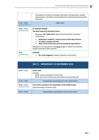 Delegations are requested to make three pledges in relation to improving refugee education in their countries. 16:45 ESSINGESALEN