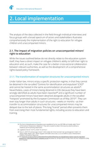 2.1. The impact of migration policies on unaccompanied minors’ right to education While the issues outlined below do not directly relate to the education system itself, they have a direct impact on refugee children’s ability to fulfil their right to education and, as such, make the case for a better cross-sectoral collaboration between relevant authorities, as well as the development of a comprehensive rights-based policy framework. 2.1.1. The transformation of reception structures for unaccompanied minors Under Italian law, minors enjoy a specific protection regime, in that they cannot be detained in the so-called “Centres for identification and expulsion” (CIE)34 and cannot be hosted in the same accommodation structures as adults35. Nevertheless, cases of minors being detained in CIEs because they have been wrongly identified as adults have been reported36 and a significant number of unaccompanied minors have been detained alongside adults in the socalled “hotspots” promoted by the European Commission as of May 201537. They can even stay longer than adults in such structures - weeks or months - as their transfer to accommodation structures for unaccompanied minors may be delayed due to the lack of places. This long “transit” period often prevents them from exercising their most fundamental rights, including access to education and training.