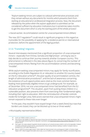 “Asylum-seeking minors are subject to colossal administrative processes and they remain without any documents for months which prevents them from starting an educational or professional integration process. Now, the document released by the police when the asylum application is submitted can be considered sufficient by education institutions but it sometimes takes months to get this document which is only the starting point of the whole process”. —Social worker, Accommodation centre for unaccompanied minors (Milan) The new 2017 regulation45 could result in significant progress in this regard as it provides for the possibility of applying for a residence permit or international protection, before the appointment of the legal guardian. 2.1.3. “Transiting” migrants Several interviewees mentioned that a significant proportion of unaccompanied minors - especially from Eritrea, Somalia and Afghanistan - arriving by sea in Italy decide to continue their journey towards another European country. This phenomenon is reflected in the data above (figure 3), concerning the number of unaccompanied minors fleeing from the accommodation centres and becoming “invisible”. While asylum-seeking unaccompanied minors may apply for family reunification, according to the Dublin Regulation III, or relocation to another EU country based on the EU relocation scheme46, the poor quality of accommodation centres, the length of administrative procedures47, and the lack of awareness concerning the existence of such opportunities were cited as the most common factors leading most (potentially eligible) minors to go underground. For example, as of December 2016, not one unaccompanied minor had benefited from the EU relocation programme48. This situation, apart from putting these children in a vulnerable position, also prevents them from exercising their fundamental rights, including their right to education. With the reintroduction of border controls inside the Schengen area, field actors warned that unaccompanied minors might remain exposed to these risks even longer: “In the past, they wouldn’t have stayed longer than a week [here] but now that borders are closed, they can be blocked up to two or three weeks”. —Municipality representative (Milan) 45 46