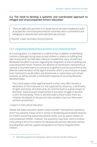 2.2.1. Integrating individual local practices at an institutional level As a starting point, it is important to underline that, in addition to identifying common challenges facing newly arrived children in relation to fulfilling their right to education, the field data collection revealed that many schools have developed “excellent” practices regarding the integration of asylum-seeking and unaccompanied minors. However, the absence of coordination mechanisms at national or local level seems to constitute a significant and structural limit to the effective implementation of the legal framework, which is very inclusive on paper. Such mechanisms would collect and disseminate or systematise such school practices, as well as provide a coordinated response to recurring obstacles identified below. “The critical aspect of the legal framework is that it very often remains a declaration of intent because it is not supported by resources, a clarification of rights and duties, who does what, etc and that leads to a great margin of discretion. Good practices implemented in one place struggle to become a norm for everybody. There is attention paid to these issues, there are initiatives developed on the ground, even excellent ones, but there aren’t common procedures”. —Expert in intercultural education Indeed, the Italian education system values schools’49 and teachers’ autonomy, which has a positive impact when it comes to developing personalised solutions for children presenting special educational needs, such as asylum seekers or unaccompanied children. However, this autonomy may never come to fruition if everything is left to the initiative of individual educational institutions without providing them with the support and guidance on how to integrate these children.