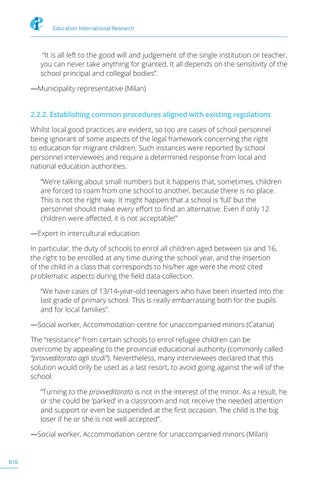 “It is all left to the good will and judgement of the single institution or teacher, you can never take anything for granted. It all depends on the sensitivity of the school principal and collegial bodies”. —Municipality representative (Milan) 2.2.2. Establishing common procedures aligned with existing regulations Whilst local good practices are evident, so too are cases of school personnel being ignorant of some aspects of the legal framework concerning the right to education for migrant children. Such instances were reported by school personnel interviewees and require a determined response from local and national education authorities. “We’re talking about small numbers but it happens that, sometimes, children are forced to roam from one school to another, because there is no place. This is not the right way. It might happen that a school is ‘full’ but the personnel should make every effort to find an alternative. Even if only 12 children were affected, it is not acceptable!” —Expert in intercultural education In particular, the duty of schools to enrol all children aged between six and 16, the right to be enrolled at any time during the school year, and the insertion of the child in a class that corresponds to his/her age were the most cited problematic aspects during the field data collection. “We have cases of 13/14-year-old teenagers who have been inserted into the last grade of primary school. This is really embarrassing both for the pupils and for local families”. —Social worker, Accommodation centre for unaccompanied minors (Catania) The “resistance” from certain schools to enrol refugee children can be overcome by appealing to the provincial educational authority (commonly called “provveditorato agli studi”). Nevertheless, many interviewees declared that this solution would only be used as a last resort, to avoid going against the will of the school. “Turning to the provveditorato is not in the interest of the minor. As a result, he or she could be ‘parked’ in a classroom and not receive the needed attention and support or even be suspended at the first occasion. The child is the big loser if he or she is not well accepted”. —Social worker, Accommodation centre for unaccompanied minors (Milan)