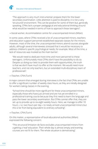 “The approach is very much instrumental: prepare them for the lower secondary examination. Little attention is paid to discipline, it is not a very ‘structured’ environment. This can be positive for some of them but, generally speaking, CPIAs lack a proper pedagogical and educational thinking around what would be needed in terms of how to approach these teenagers”. —Social worker, Accommodation centre for unaccompanied minors (Milan) In some cases, where CPIAs received a lot of unaccompanied minors, teachers and education support personnel established separate classes for the minors. However, most of the time, the unaccompanied minors attend courses alongside adults, although several interviewees stressed that it would be necessary to address children’s specific psychological needs, for example. Most of the time, a lack of resources was invoked as the main barrier: “We would need to dedicate more time and more personnel to these teenagers. Unfortunately most CPIAs don’t have the possibility to do so. Despite us doing our best to provide them with opportunities, the truth is that we don’t have much to offer at the moment. We would need more teachers, and not only teachers, but an extended multi-disciplinary team of professionals”. —Teacher, CPIA (Turin) A major concern that emerged during interviews is the fact that CPIAs are unable to offer a significant number of weekly class hours, as they are initially designed for workers taking classes in the evening. “School time should be more significant for these unaccompanied minors, especially those who have just arrived and are not yet enrolled in a professional training course because they first need to learn the language and pass the lower secondary examination. But CPIAs cannot offer that, they are set up to provide up to six-eight weekly hours. Here, we manage to offer 10 hours – i.e. two hours per day – to newly arrived unaccompanied minors but this is far from being equivalent to ordinary schooling”. —Teacher, CPIA (Turin) On this matter, a representative of local educational authorities (Milan) expressed the following concern: “This structural limitation de facto excludes unaccompanied minors from a getting a ‘real’ education. Their whole day is almost empty and evening courses are not fit for them. The whole situation is demotivating”.
