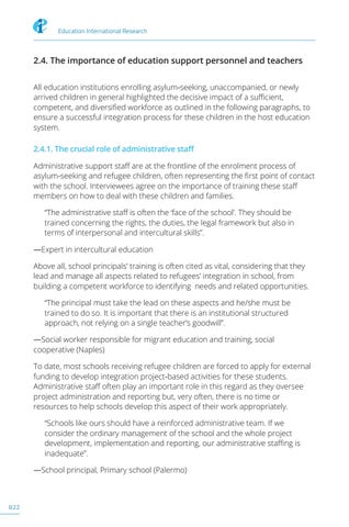 2.4. The importance of education support personnel and teachers All education institutions enrolling asylum-seeking, unaccompanied, or newly arrived children in general highlighted the decisive impact of a sufficient, competent, and diversified workforce as outlined in the following paragraphs, to ensure a successful integration process for these children in the host education system. 2.4.1. The crucial role of administrative staff Administrative support staff are at the frontline of the enrolment process of asylum-seeking and refugee children, often representing the first point of contact with the school. Interviewees agree on the importance of training these staff members on how to deal with these children and families. “The administrative staff is often the ‘face of the school’. They should be trained concerning the rights, the duties, the legal framework but also in terms of interpersonal and intercultural skills”. —Expert in intercultural education Above all, school principals’ training is often cited as vital, considering that they lead and manage all aspects related to refugees’ integration in school, from building a competent workforce to identifying needs and related opportunities. “The principal must take the lead on these aspects and he/she must be trained to do so. It is important that there is an institutional structured approach, not relying on a single teacher’s goodwill”. —Social worker responsible for migrant education and training, social cooperative (Naples) To date, most schools receiving refugee children are forced to apply for external funding to develop integration project-based activities for these students. Administrative staff often play an important role in this regard as they oversee project administration and reporting but, very often, there is no time or resources to help schools develop this aspect of their work appropriately. “Schools like ours should have a reinforced administrative team. If we consider the ordinary management of the school and the whole project development, implementation and reporting, our administrative staffing is inadequate”. —School principal, Primary school (Palermo)