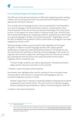2.4.3. Teaching refugees and asylum seekers The difficulty of educational institutions in effectively integrating asylum-seeking children and unaccompanied minors has also often been linked to the lack of appropriate training for teachers. First, schools require language teachers who are specialised in teaching Italian as a second language or teaching illiterate students, considering that many unaccompanied minors do not have any educational background in their home country. In this regard, the recent reform “La Buona Scuola” (Law 107/2015) has led to substantial progress by recognising academic qualifications to teach Italian as a second language in teacher recruitment processes61. Regrettably, none of the 500 candidates who qualified in 2016 to teach Italian to foreigners have been assigned any school so far62. Teaching refugee children requires specific skills regardless of the taught discipline. In addition to Italian language teachers with subject-specific qualifications, schools also need well-prepared teachers in all disciplines who are sensitised to the specificity of learning a second language in the context of migration and trained to adapt their teaching practice to multicultural contexts (e.g. teaching the technical lexicon and using nonverbal communication supports), which is rarely the case. “To teach foreign students, you need a specialisation. We [teachers] had to adapt, look for resources and advice on the internet”. —Teacher, Lower-secondary school (Catania) Interviewees also highlighted the need for training on how to evaluate newly arrived students when they do not speak the local language as key to a successful integration process in school. “Another aspect that is missing is everything related to assessing the student’s competences when he/she arrives. The risk is to limit it to deficits and gaps, without valuing existing competences: talents, know-how, linguistic skills, etc”. —Expert in intercultural education