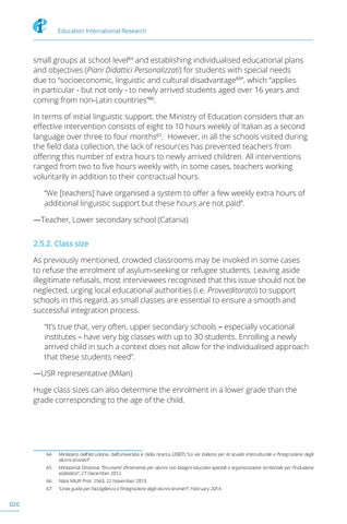small groups at school level64 and establishing individualised educational plans and objectives (Piani Didattici Personalizzati) for students with special needs due to “socioeconomic, linguistic and cultural disadvantage65”, which “applies in particular - but not only - to newly arrived students aged over 16 years and coming from non-Latin countries”66. In terms of initial linguistic support, the Ministry of Education considers that an effective intervention consists of eight to 10 hours weekly of Italian as a second language over three to four months67. However, in all the schools visited during the field data collection, the lack of resources has prevented teachers from offering this number of extra hours to newly arrived children. All interventions ranged from two to five hours weekly with, in some cases, teachers working voluntarily in addition to their contractual hours. “We [teachers] have organised a system to offer a few weekly extra hours of additional linguistic support but these hours are not paid”. —Teacher, Lower secondary school (Catania) 2.5.2. Class size As previously mentioned, crowded classrooms may be invoked in some cases to refuse the enrolment of asylum-seeking or refugee students. Leaving aside illegitimate refusals, most interviewees recognised that this issue should not be neglected, urging local educational authorities (i.e. Provveditorato) to support schools in this regard, as small classes are essential to ensure a smooth and successful integration process. “It’s true that, very often, upper secondary schools – especially vocational institutes – have very big classes with up to 30 students. Enrolling a newly arrived child in such a context does not allow for the individualised approach that these students need”. —USR representative (Milan) Huge class sizes can also determine the enrolment in a lower grade than the grade corresponding to the age of the child.