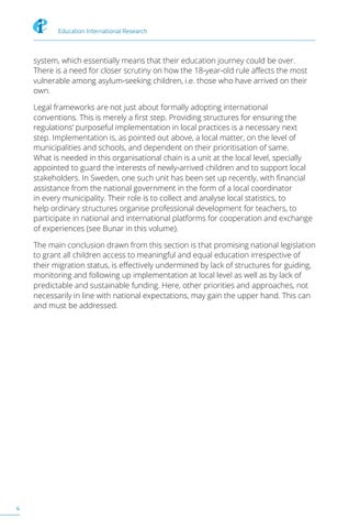 system, which essentially means that their education journey could be over. There is a need for closer scrutiny on how the 18-year-old rule affects the most vulnerable among asylum-seeking children, i.e. those who have arrived on their own. Legal frameworks are not just about formally adopting international conventions. This is merely a first step. Providing structures for ensuring the regulations’ purposeful implementation in local practices is a necessary next step. Implementation is, as pointed out above, a local matter, on the level of municipalities and schools, and dependent on their prioritisation of same. What is needed in this organisational chain is a unit at the local level, specially appointed to guard the interests of newly-arrived children and to support local stakeholders. In Sweden, one such unit has been set up recently, with financial assistance from the national government in the form of a local coordinator in every municipality. Their role is to collect and analyse local statistics, to help ordinary structures organise professional development for teachers, to participate in national and international platforms for cooperation and exchange of experiences (see Bunar in this volume). The main conclusion drawn from this section is that promising national legislation to grant all children access to meaningful and equal education irrespective of their migration status, is effectively undermined by lack of structures for guiding, monitoring and following up implementation at local level as well as by lack of predictable and sustainable funding. Here, other priorities and approaches, not necessarily in line with national expectations, may gain the upper hand. This can and must be addressed.
