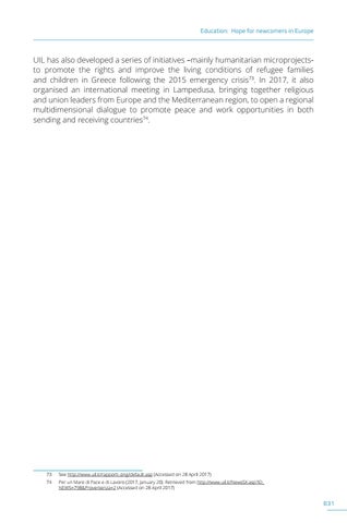 UIL has also developed a series of initiatives –mainly humanitarian microprojectsto promote the rights and improve the living conditions of refugee families and children in Greece following the 2015 emergency crisis73. In 2017, it also organised an international meeting in Lampedusa, bringing together religious and union leaders from Europe and the Mediterranean region, to open a regional multidimensional dialogue to promote peace and work opportunities in both sending and receiving countries74.