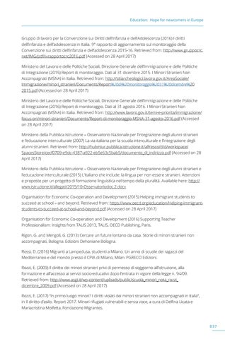 Gruppo di lavoro per la Convenzione sui Diritti dell’Infanzia e dell’Adolescenza (2016) I diritti dell’infanzia e dell’adolescenza in Italia. 9° rapporto di aggiornamento sul monitoraggio della Convenzione sui diritti dell’infanzia e dell’adolescenza 2015-16. Retrieved from: http://www.gruppocrc. net/IMG/pdf/ixrapportocrc2016.pdf (Accessed on 28 April 2017) Ministero del Lavoro e delle Politiche Sociali, Direzione Generale dell’Immigrazione e delle Politiche di Integrazione (2015) Report di monitoraggio. Dati al 31 dicembre 2015. I Minori Stranieri Non Accompagnati (MSNA) in Italia. Retrieved from: http://sitiarcheologici.lavoro.gov.it/AreaSociale/ Immigrazione/minori_stranieri/Documents/Report%20di%20monitoraggio%2031%20dicembre%20 2015.pdf (Accessed on 28 April 2017) Ministero del Lavoro e delle Politiche Sociali, Direzione Generale dell’Immigrazione e delle Politiche di Integrazione (2016) Report di monitoraggio. Dati al 31 agosto 2016. I Minori Stranieri Non Accompagnati (MSNA) in Italia. Retrieved from: http://www.lavoro.gov.it/temi-e-priorita/immigrazione/ focus-on/minori-stranieri/Documents/Report-di-monitoraggio-MSNA-31-agosto-2016.pdf (Accessed on 28 April 2017) Ministero della Pubblica Istruzione – Osservatorio Nazionale per l’integrazione degli alunni stranieri e l’educazione interculturale (2007) La via italiana per la scuola interculturale e l’integrazione degli alunni stranieri. Retrieved from: http://hubmiur.pubblica.istruzione.it/alfresco/d/d/workspace/ SpacesStore/cecf0709-e9dc-4387-a922-eb5e63c5bab5/documento_di_indirizzo.pdf (Accessed on 28 April 2017) Ministero della Pubblica Istruzione – Osservatorio Nazionale per l’integrazione degli alunni stranieri e l’educazione interculturale (2015) L’Italiano che include: la lingua per non essere stranieri. Attenzioni e proposte per un progetto di formazione linguistica nel tempo della pluralità. Available here: http:// www.istruzione.it/allegati/2015/10-Osservatoriodoc.2.docx Organisation for Economic Co-operation and Development (2015) Helping immigrant students to succeed at school – and beyond. Retrieved from: https://www.oecd.org/education/Helping-immigrantstudents-to-succeed-at-school-and-beyond.pdf (Accessed on 28 April 2017) Organisation for Economic Co-operation and Development (2016) Supporting Teacher Professionalism: Insights from TALIS 2013, TALIS, OECD Publishing, Paris. Rigon, G. and Mengoli, G. (2013) Cercare un future lontano da casa. Storie di minori stranieri non accompagnati, Bologna: Edizioni Dehoniane Bologna. Rossi, D. (2016) Migranti a Lampedusa, studenti a Milano. Un anno di scuole dei ragazzi del Mediterraneo e del mondo presso il CPIA di Milano, Milan: PGRECO Edizioni. Rozzi, E. (2009) Il diritto dei minori stranieri privi di permesso di soggiorno all’istruzione, alla formazione e all’accesso ai servizi socio-educativi dopo l’entrata in vigore della legge n. 94/09. Retrieved from: http://www.asgi.it/wp-content/uploads/public/scuola_minori_nota_rozzi_ dicembre_2009.pdf (Accessed on 28 April 2017) Rozzi, E. (2017) “In primo luogo minori? I diritti violati dei minori stranieri non accompagnati in Italia”, in Il diritto d’asilo. Report 2017. Minori rifugiati vulnerabili e senza voce, a cura di Delfina Licata e Mariacristina Molfetta, Fondazione Migrantes.