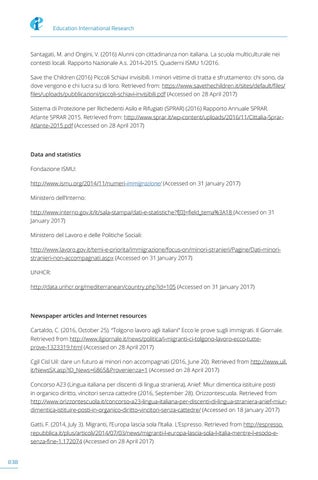 Newspaper articles and Internet resources Cartaldo, C. (2016, October 25). “Tolgono lavoro agli italiani” Ecco le prove sugli immigrati. Il Giornale. Retrieved from http://www.ilgiornale.it/news/politica/i-migranti-ci-tolgono-lavoro-ecco-tutteprove-1323319.html (Accessed on 28 April 2017) Cgil Cisl Uil: dare un futuro ai minori non accompagnati (2016, June 20). Retrieved from http://www.uil. it/NewsSX.asp?ID_News=6865&Provenienza=1 (Accessed on 28 April 2017) Concorso A23 (Lingua italiana per discenti di lingua straniera), Anief: Miur dimentica istituire posti in organico diritto, vincitori senza cattedre (2016, September 28). Orizzontescuola. Retrieved from http://www.orizzontescuola.it/concorso-a23-lingua-italiana-per-discenti-di-lingua-straniera-anief-miurdimentica-istituire-posti-in-organico-diritto-vincitori-senza-cattedre/ (Accessed on 18 January 2017) Gatti, F. (2014, July 3). Migranti, l’Europa lascia sola l’Italia. L’Espresso. Retrieved from http://espresso. repubblica.it/plus/articoli/2014/07/03/news/migranti-l-europa-lascia-sola-l-italia-mentre-l-esodo-esenza-fine-1.172074 (Accessed on 28 April 2017) B 38