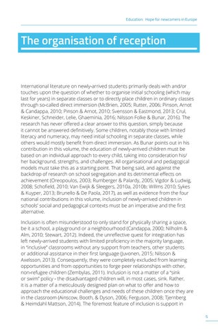 International literature on newly-arrived students primarily deals with and/or touches upon the question of whether to organise initial schooling (which may last for years) in separate classes or to directly place children in ordinary classes through so-called direct immersion (McBrien, 2005; Rutter, 2006; Pinson, Arnot & Candappa, 2010; Pinson & Arnot, 2010; Svensson & Eastmond, 2013; Crul, Keskiner, Schneider, Lelie, Ghaeminia, 2016; Nilsson Folke & Bunar, 2016). The research has never offered a clear answer to this question, simply because it cannot be answered definitively. Some children, notably those with limited literacy and numeracy, may need initial schooling in separate classes, while others would mostly benefit from direct immersion. As Bunar points out in his contribution in this volume, the education of newly-arrived children must be based on an individual approach to every child, taking into consideration his/ her background, strengths, and challenges. All organisational and pedagogical models must take this as a starting point. That being said, and against the backdrop of research on school segregation and its detrimental effects on achievement (Oreopoulos, 2003; Rumberger & Palardy, 2005; Vigdor & Ludwig, 2008; Schofield, 2010; Van Ewijk & Sleegers, 2010a, 2010b; Willms 2010; Sykes & Kuyper, 2013; Brunello & De Paola, 2017), as well as evidence from the four national contributions in this volume, inclusion of newly-arrived children in schools’ social and pedagogical contexts must be an imperative and the first alternative. Inclusion is often misunderstood to only stand for physically sharing a space, be it a school, a playground or a neighbourhood (Candappa, 2000; Nilholm & Alm, 2010; Stewart, 2012). Indeed, the unreflective quest for integration has left newly-arrived students with limited proficiency in the majority language, in “inclusive” classrooms without any support from teachers, other students or additional assistance in their first language (Juvonen, 2015; Nilsson & Axelsson, 2013). Consequently, they were completely excluded from learning opportunities and from opportunities to forge peer relationships with other, non-refugee children (Zembylas, 2011). Inclusion is not a matter of a “sink or swim” policy - the disadvantaged children will, in most cases, sink. Rather, it is a matter of a meticulously designed plan on what to offer and how to approach the educational challenges and needs of these children once they are in the classroom (Ainscow, Booth, & Dyson, 2006; Ferguson, 2008; Tjernberg & Heimdahl Mattson, 2014). The foremost feature of inclusion is support in 5