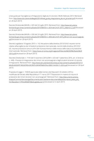 Linee guida per l’accoglienza e l’integrazione degli alunni stranieri, MIUR, febbraio 2014. Retrieved from: http://www.istruzione.it/allegati/2014/linee_guida_integrazione_alunni_stranieri.pdf (Accessed on 28 April 2017) Decreto Direttoriale (MIUR) n. 829 del 24 luglio 2015. Retrieved from: http://www.istruzione. lombardia.gov.it/wp-content/uploads/2015/08/DD-n.-829-del-24.07.2015-_Italiano-L2.pdf (Accessed on 28 April 2017) Decreto Direttoriale (MIUR) n. 830 del 24 luglio 2015. Retrieved from: http://www.istruzione. lombardia.gov.it/wp-content/uploads/2015/08/DD-n.-830-del-24.07.2015_Minori-non-accompagnati. pdf (Accessed on 28 April 2017) Decreto Legislativo 18 agosto 2015 n. 142 Attuazione della direttiva 2013/33/UE recante norme relative all’accoglienza dei richiedenti protezione internazionale, nonché della direttiva 2013/32/ UE, recante procedure comuni ai fini del riconoscimento e della revoca dello status di protezione internazionale. Retrieved from: https://www.cir-onlus.org/images/pdf/decreto%2030%20sette%20 2015.pdf (Accessed on 28 April 2017) Decretto Direttoriale n. 1144 del 9 novembre 2016 (DM n. 633 del 1 settembre 2016, art. 4, fondi ex L. 440) - Processi di integrazione dei minori non accompagnati e degli studenti stranieri di recente immigrazione. Retrieved from: http://www.istruzioneveneto.it/wpusr/wp-content/uploads/2016/11/ MIUR.AOODPIT.REGISTRO-DECRETI-DIPARTIMENTALI.0001144.09-11-2016.pdf (Accessed on 28 April 2017) Proposta di Legge n. 1658-B approvata dalla Camera dei Deputati il 26 ottobre 2016 e modificata dal Senato della Repubblica il 1° marzo 2017 “Disposizioni in materia di misure di protezione dei minori stranieri non accompagnati”. Retrieved from: http://documenti.camera. it/apps/CommonServices/getDocumento.ashx?sezione=documenti&tipoDoc=lavori_testo_pdl_ html&codice=17PDL0050070&idLegislatura=17 (Accessed on 6 April 2017)