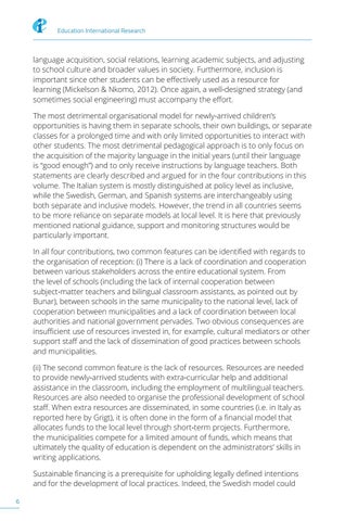 language acquisition, social relations, learning academic subjects, and adjusting to school culture and broader values in society. Furthermore, inclusion is important since other students can be effectively used as a resource for learning (Mickelson & Nkomo, 2012). Once again, a well-designed strategy (and sometimes social engineering) must accompany the effort. The most detrimental organisational model for newly-arrived children’s opportunities is having them in separate schools, their own buildings, or separate classes for a prolonged time and with only limited opportunities to interact with other students. The most detrimental pedagogical approach is to only focus on the acquisition of the majority language in the initial years (until their language is “good enough”) and to only receive instructions by language teachers. Both statements are clearly described and argued for in the four contributions in this volume. The Italian system is mostly distinguished at policy level as inclusive, while the Swedish, German, and Spanish systems are interchangeably using both separate and inclusive models. However, the trend in all countries seems to be more reliance on separate models at local level. It is here that previously mentioned national guidance, support and monitoring structures would be particularly important. In all four contributions, two common features can be identified with regards to the organisation of reception: (i) There is a lack of coordination and cooperation between various stakeholders across the entire educational system. From the level of schools (including the lack of internal cooperation between subject-matter teachers and bilingual classroom assistants, as pointed out by Bunar), between schools in the same municipality to the national level, lack of cooperation between municipalities and a lack of coordination between local authorities and national government pervades. Two obvious consequences are insufficient use of resources invested in, for example, cultural mediators or other support staff and the lack of dissemination of good practices between schools and municipalities. (ii) The second common feature is the lack of resources. Resources are needed to provide newly-arrived students with extra-curricular help and additional assistance in the classroom, including the employment of multilingual teachers. Resources are also needed to organise the professional development of school staff. When extra resources are disseminated, in some countries (i.e. in Italy as reported here by Grigt), it is often done in the form of a financial model that allocates funds to the local level through short-term projects. Furthermore, the municipalities compete for a limited amount of funds, which means that ultimately the quality of education is dependent on the administrators’ skills in writing applications. Sustainable financing is a prerequisite for upholding legally defined intentions and for the development of local practices. Indeed, the Swedish model could 6