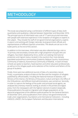 This study was prepared using a combination of different types of data, both quantitative and qualitative, collected between September and December 2016. The principal source of information was a set of 17 semi-structured interviews with people with extensive experience in the reception of refugees or experts in the subject. They include the staff of non-governmental organisations, experts in asylum and working with foreign nationals, local government officials and representatives of different Spanish universities. The details are set out in the bullet points at the end of this section. In addition to the interviews, information was also collected during a visit to 16 primary and secondary schools with a high proportion of pupils who are refugees, have been displaced by force, and/or are seeking international protection and migrant status, located in the country’s four most densely populated autonomous communities (Catalonia, Basque Country, Autonomous Community of Valencia, Autonomous Community of Madrid). In each of these schools we spoke to teachers, head teachers and other education professionals, as well as to the refugee pupils and a selection of the mothers and fathers of this group of students. Finally, there were two additional sources of data, of a secondary nature. Firstly, a quantitative analysis of data on the flow and the reception of refugees published by official bodies, including the National Institute of Statistics, the Ministry of the Interior, the Ministry of Education, Culture and Sport, the Office of the Ombudsman, and different local administrations, was carried out. Secondly, in order to capture the feelings of the public and principal social agents, we analysed documentary material, looking at articles in the printed and digital press, from the newspapers with the highest national circulation (especially those publications focused on migration and refugee population); at the electoral programmes of the different political parties for the General Elections of December 2015; and at publications from various non-governmental and trade union organisations, foundations and international institutions - including UNESCO, UNICEF, the European Parliament and Education International.