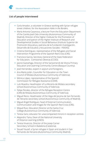 • Carla Amador, a volunteer in Greece working with Syrian refugee street children, for the Association Holes in the Borders. • María Antonia Casanova, a lecturer from the Education Department of the Camilo José Cela University (Autonomous Community of Madrid), Director of the Higher Institute for the Promotion of Education and patron of the Higher Institute of Research and Developmental Studies in Social Behaviour (Instituto Superior de Promoción Educativa y patrona de la Fundación Investigación, Desarrollo de Estudios y Actuaciones Sociales - FIDEAS). • Cristina Domínguez, representative of the Refugees and Social Intervention Programme of the Spanish Red Cross (CRE). • Francisco García, Secretary General of the State Federation for Education, Comisiones Obreras (CCOO). • Jaione Gaztañaga, Director of the Sansomendi de Vitoria Primary Education and Learning Community Centre (Basque Country). • José Hernández, expert in asylum and foreigners. • Ana María Julián, Councillor for Education on the Town Council of Mislata (Autonomous Community of Valencia). • Mónica López, representative of the Spanish Commission for Refugee Assistance (CEAR). • Luís Muedra, Headmaster of La Morería de Mislata secondary school (Autonomous Community of Valencia). • Felipe Perales, director of the Refugee Reception Centre (CAR) de Mislata (Autonomous Community of Valencia). • Miguel Recio. Headmaster of the Vega del Jarama de San Fernando de Henares secondary school (Autonomous Community of Madrid). • Miguel Ángel Rodríguez, head of External Communication, Communication and Images for the Spanish Red Cross (CRE). • Miquel Ruiz, Education Director at the Santa Cruz College (Autonomous Community of Valencia). • Teresa Sanz, educator for unaccompanied minors in reception centres • Alejandro Tiana, Dean of the National University of Distance Learning (UNED). • Teresa Vivancos, Director of the Josep Carner Secondary School in Badalona (Catalonia). • Souad Yousef, a Syrian refugee in Spain and student in San Fernando de Henares (Autonomous Community Madrid). C2